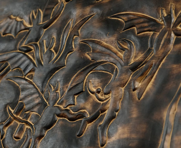 Melding historical and literary references with poignant personal experiences, Lu’s work tells stories of dissonance and longing through twirling odysseys of ancient mythologies that carry the echoes of trauma, transformation, and regeneration. His sculptures and paintings are made of burnt wood panels, linen, engraved metal, and concrete, with elaborate scenes of a mythological retelling. Through pyrography (writing with fire) and the use of extensive and subversive titles for his works, Lu returns to the poetic origins of storytelling that liberate his work from established linear hierarchies of thought and form. The profound meditative and laborious repetition of his burning spans greatly in scale, from intimate to immersive, and allows Lu to build worlds where mythological and autobiographical come together and are thus reborn.
